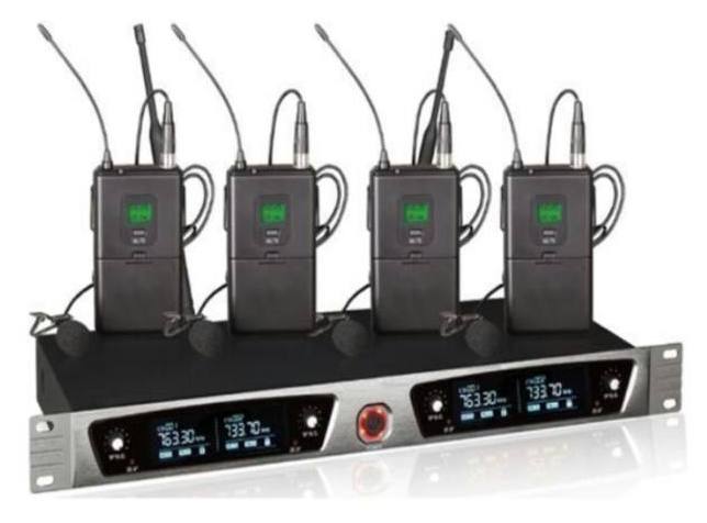 Четырехканальная беспроводная микрофонная система с петличными микрофонами, наголовными гарнитурами (на каждый канал)
